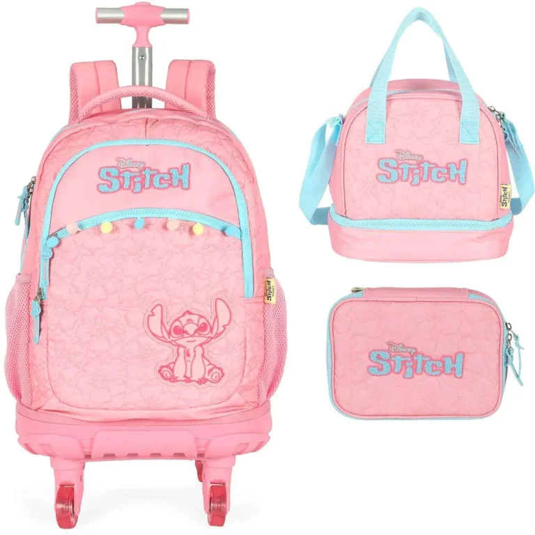 KIT Mochila Infantil Rodinhas Stitch com Lancheira e Estojo Rosa