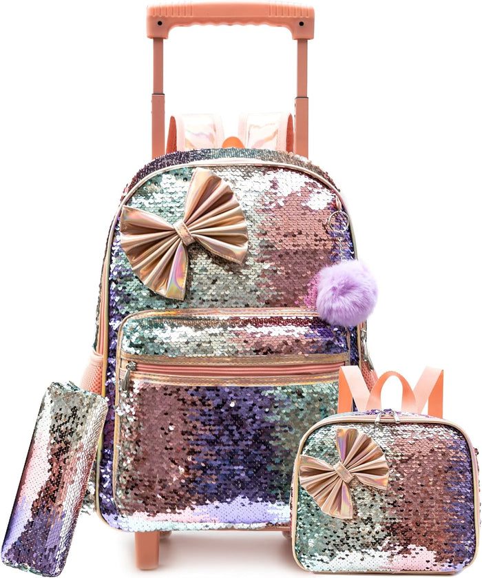 KIT MOCHILAS MENINA DE LUXO – MOCHILA DE RODINHAS + LANCHEIRA + ESTOJO GRANDE