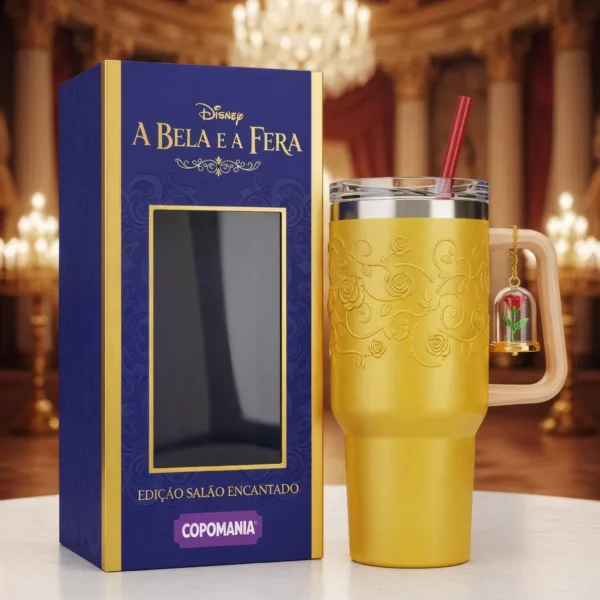 ✨ Um brinde ao amor que vence a fera! Este Copo Térmico dourado traz arabescos de rosas em relevo 3D que lembram o vestido da Bela no salão de baile. Na alça, o pingente da icônica rosa sob cúpula de vidro reluz a cada gole, como um lembrete de que o tempo é precioso.