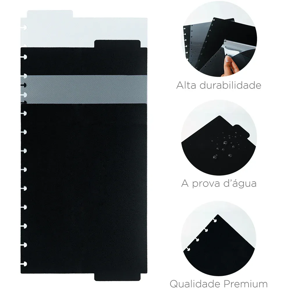 Ele tem tudo o que você precisa: facilidades como elástico e bolsa plástica, além de fluidez com folhas e capas destacáveis.