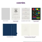 Com acabamento premium em hotstamping dourado, folhas off-white personalizadas, adesivos temáticos e divisórias azuis.