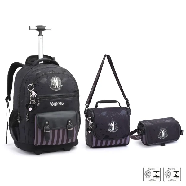 Características: KIT ESCOLAR WANDINHA SUPER ESTILOSO COM FRENTE EM GLITTER E CHAVEIRO EXCLUSIVO DA MÃOZINHA. CONTÉM MOCHILA DE RODINHAS CONFORTÁVEL (30,5 X 43 X 13,5 CM) LANCHEIRA TÉRMICA PRÁTICA (19 X 22 X 11 CM) E ESTOJO DUPLO ESPAÇOSO (21 X 8,5 X 6 CM) . UM KIT ESCOLAR COMPLETO QUE UNE BRILHO, ATITUDE E A PERSONALIDADE ÚNICA DA PERSONAGEM! MATERIAL: 60% POLIÉSTER 30% PVC 10% PU.